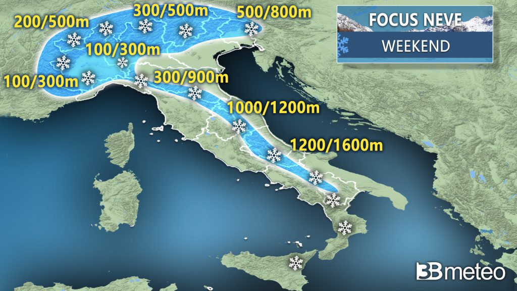 NEL WEEKEND NUOVE PERTURBAZIONI, CON NEVE A BASSA QUOTA AL NORD – “Nel corso di mercoledì il vortice Harry si esaurirà al Sud, dove entro sera il tempo migliorerà quasi ovunque” – prosegue Mazzoleni di 3bmeteo.com – “Tuttavia, una nuova energica circolazione depressionaria si sta organizzando sull’Europa occidentale, dalla quale dipartirà una serie di perturbazioni che nel weekend raggiungerà la nostra Penisola. Già sul finire di giovedì il tempo tornerà a peggiorare su Sardegna e alto versante tirrenico, mentre venerdì il maltempo si estenderà a tutto il Nord, alle regioni tirreniche centro-settentrionali e a parte del medio Adriatico. Oltre alle piogge, la neve tornerà a interessare il Nord fino a quote di collina o, a tratti, anche in pianura al Nord-Ovest tra la sera e la notte su sabato. Non sarà l’unico peggioramento perché, dopo una parziale attenuazione, un secondo fronte investirà l’Italia entro la serata di sabato, coinvolgendo questa volta anche il Centro-Sud con fenomeni a tratti intensi. Tra sabato e domenica ulteriori nevicate sono attese su Alpi e Prealpi, inizialmente oltre i 300-800 m – a tratti ancora a bassa pianura o in pianura all’estremo Nord-Ovest – ma in lieve rialzo; dai 500-900 m anche sull’Appennino settentrionale e sotto i 1500 m su quello centrale.”