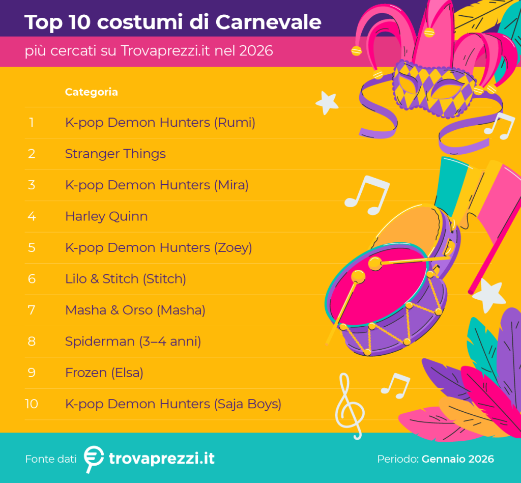 Significativa, invece, l’uscita completa dalla top ten dei costumi di Squid Game, che lo scorso anno erano secondi per ricerche, e di Sonic, terzo nel 2025: un ricambio rapido che evidenzia quanto il Carnevale segua ormai le logiche dei trend culturali, più che quelle della tradizione.