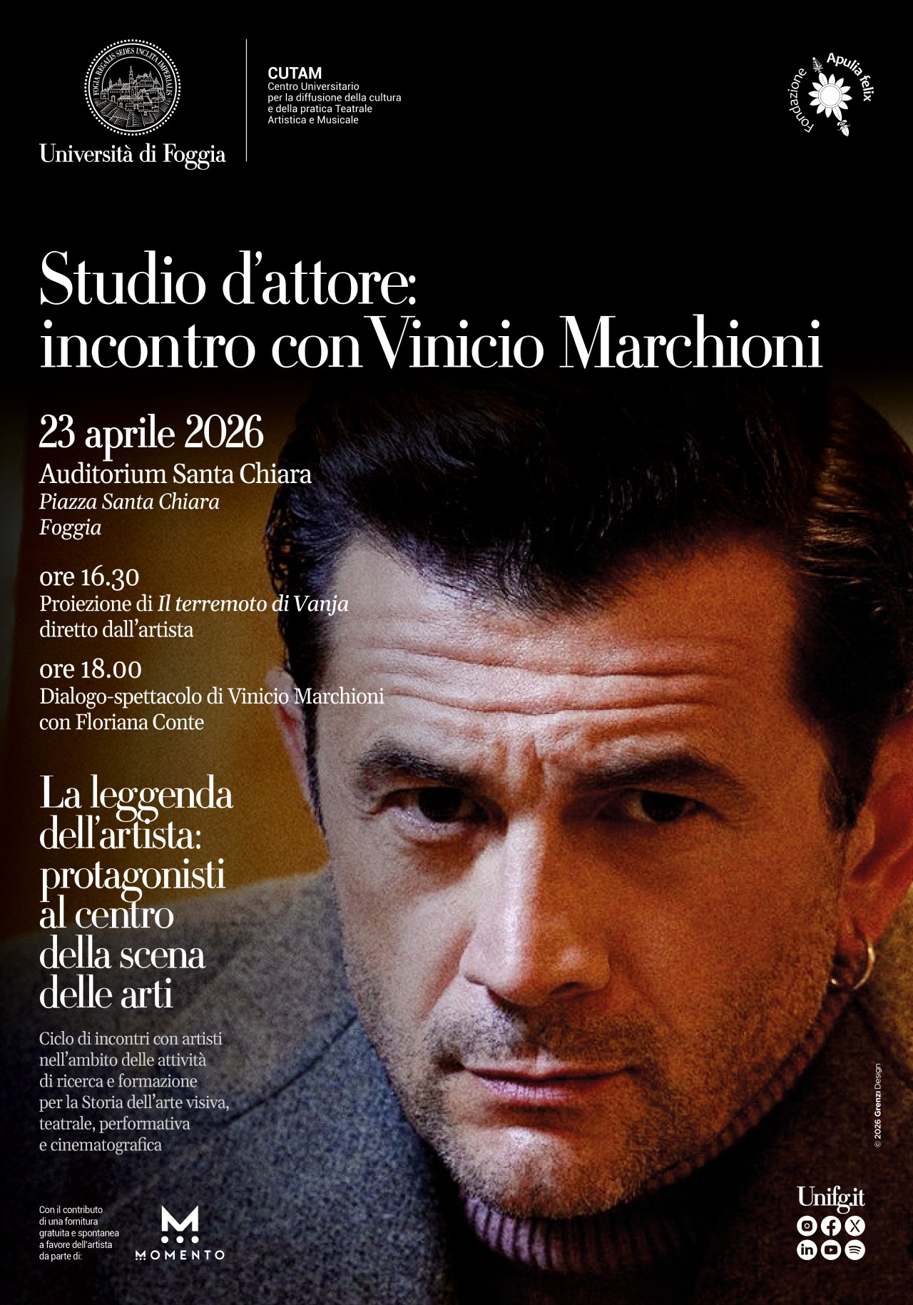 “Dopo i primi due appuntamenti che hanno registrato una partecipazione sensibile e attenta, continuiamo questo percorso con un artista di grande profondità – dichiara la prof.ssa Floriana Conte –. L’incontro con Vinicio Marchioni rappresenta un’occasione preziosa per riflettere sul rapporto tra tradizione e sperimentazione, tra parola e messa in scena, offrendo agli studenti strumenti critici e stimoli creativi”.