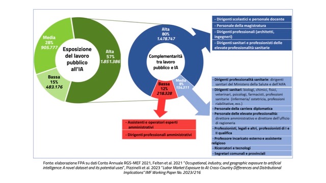 Roma – Il settore pubblico è fortemente impattato dall’adozione dell’intelligenza artificiale. Il 57% dei 3,2 milioni di dipendenti pubblici italiani è altamente “esposto” all’impatto dell’IA nella propria attività, ovvero sarà interessato da una forte interazione tra le mansioni svolte e quelle che gli algoritmi sono in grado di svolgere. Questa interazione potrà tradursi in un arricchimento delle attività grazie all’apporto dell’IA, oppure in una sostituzione dei lavoratori. Si tratta di ben 1,8 milioni di persone, in particolare dirigenti, ruoli direttivi, tecnici, ricercatori, insegnanti, legali, architetti, ingegneri, professionisti sanitari e assistenti amministrativi.