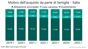 Le famiglie comprano l’abitazione principale nel 72,4% dei casi, gli acquisti per investimento si attestano al 19,5% e le compravendite di case vacanza compongono l’8,1% delle operazioni. In questa prima parte del 2025 la percentuale di acquisti per investimento evidenzia una contrazione, dal 20,5% al 19,5%. La percentuale di acquisto di case vacanza rimane alta (8,1%), sostanzialmente uguale a quella registrata nella prima parte del 2024. L’arrivo della pandemia ha determinato un netto aumento delle richieste e delle compravendite di case vacanza: la quota è infatti passata dal 6-7% del triennio 2019-2021 all’8-9% degli anni successivi. Resta prevalente l’acquisto dell’abitazione principale (72,4%), quota in aumento rispetto al 2024.