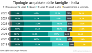 Focalizzando l’analisi solo sugli acquisti da parte di famiglie, si evidenzia come la tipologia più compravenduta sia il trilocale, scelto nel 33% dei casi. Al secondo posto si piazzano le soluzioni indipendenti e semindipendenti che si attestano al 24,4%. Le tipologie indipendenti hanno evidenziato negli ultimi anni un netto aumento di richieste e compravendite in seguito alla pandemia. Nella prima parte del 2021 avevano infatti raggiunto il 26,6%; a partire dal 2022 si osserva un rallentamento di questa tendenza, pur restando su livelli superiori a quelli precedenti all’emergenza sanitaria. Alta anche la percentuale di acquisto di 4 locali, che nella prima parte dell’anno si conferma oltre il 19%.