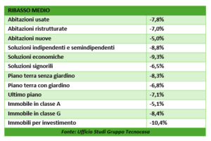 Informazioni interessanti arrivano dai ribassi praticati a seconda delle classi energetiche dell’immobile: si va da -5,1% per gli immobili in classe A e -8,4% per quelli in classe G.