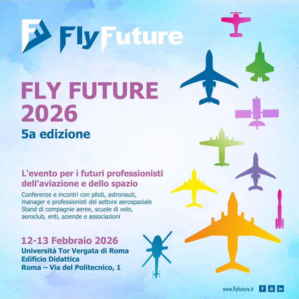 “Fly Future 2026” è organizzato dall’associazione Ifimedia, dall’Università di Roma Tor Vergata e da Mediarkè con la collaborazione di ENAV. Main sponsor sono Urbe Aero Flight Academy, Avio e ITS Academy per Mobilità Sostenibile e Aerospazio Puglia, mentre i partner sono Professional Aviation Academy, Cantor Air, FlyBy Aviation Academy, Aero Club di Roma, Quick Turn Engine Center Europe, Mobilita ITS Academy Lombardia e ITS Meccatronico Lazio Academy. La partecipazione è aperta a tutti, previa registrazione online e acquisto di un pass valido per le due giornate. Ulteriori informazioni su www.flyfuture.it.