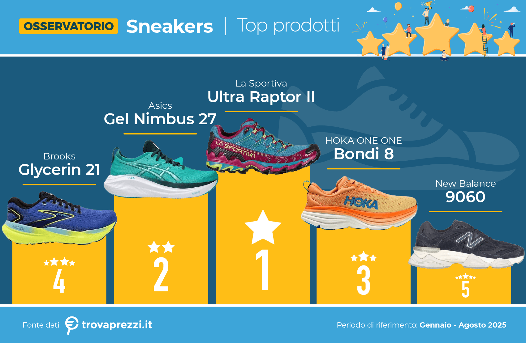 Nei primi otto mesi del 2025, la classifica dei modelli più cercati su Trovaprezzi.it conferma una chiara preferenza per scarpe da running e trail ad alte prestazioni. Al primo posto si trova La Sportiva Ultra Raptor II, ideale per terreni tecnici grazie all’ammortizzazione elevata, alla protezione del piede e al sistema Impact Brake System™ che garantisce trazione su superfici irregolari. Seguono Asics Gel Nimbus 27, con la sua ammortizzazione PureGEL e FF BLAST™ PLUS per una falcata fluida e confortevole, e HOKA One One Bondi 8, famosa per la massima ammortizzazione, il Meta-Rocker che facilita la transizione del passo e il comfort su lunghe distanze. Al quarto posto c’è Brooks Glycerin 21, che unisce ammortizzazione morbida e reattiva a stabilità e traspirabilità, mentre la New Balance 9060 chiude la top 5 con un design versatile che abbina comfort quotidiano e prestazioni leggere. La popolarità di questi modelli dimostra come i consumatori italiani scelgano le sneakers non solo per lo stile, ma per le caratteristiche tecniche, valutando ammortizzazione, supporto e performance, e considerandole strumenti di lifestyle e benessere quotidiano.