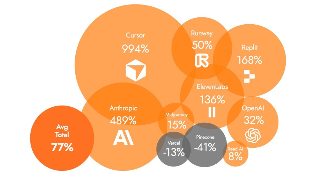 Aumenta del +77% anche l’investimento medio per azienda, segno di un utilizzo sempre più strutturato e meno sperimentale. Le imprese europee stanno privilegiando software specialistici e verticali: la spesa per Cursor, editor di codice basato su AI, registra un +994%, seguita da Anthropic con un +489%.